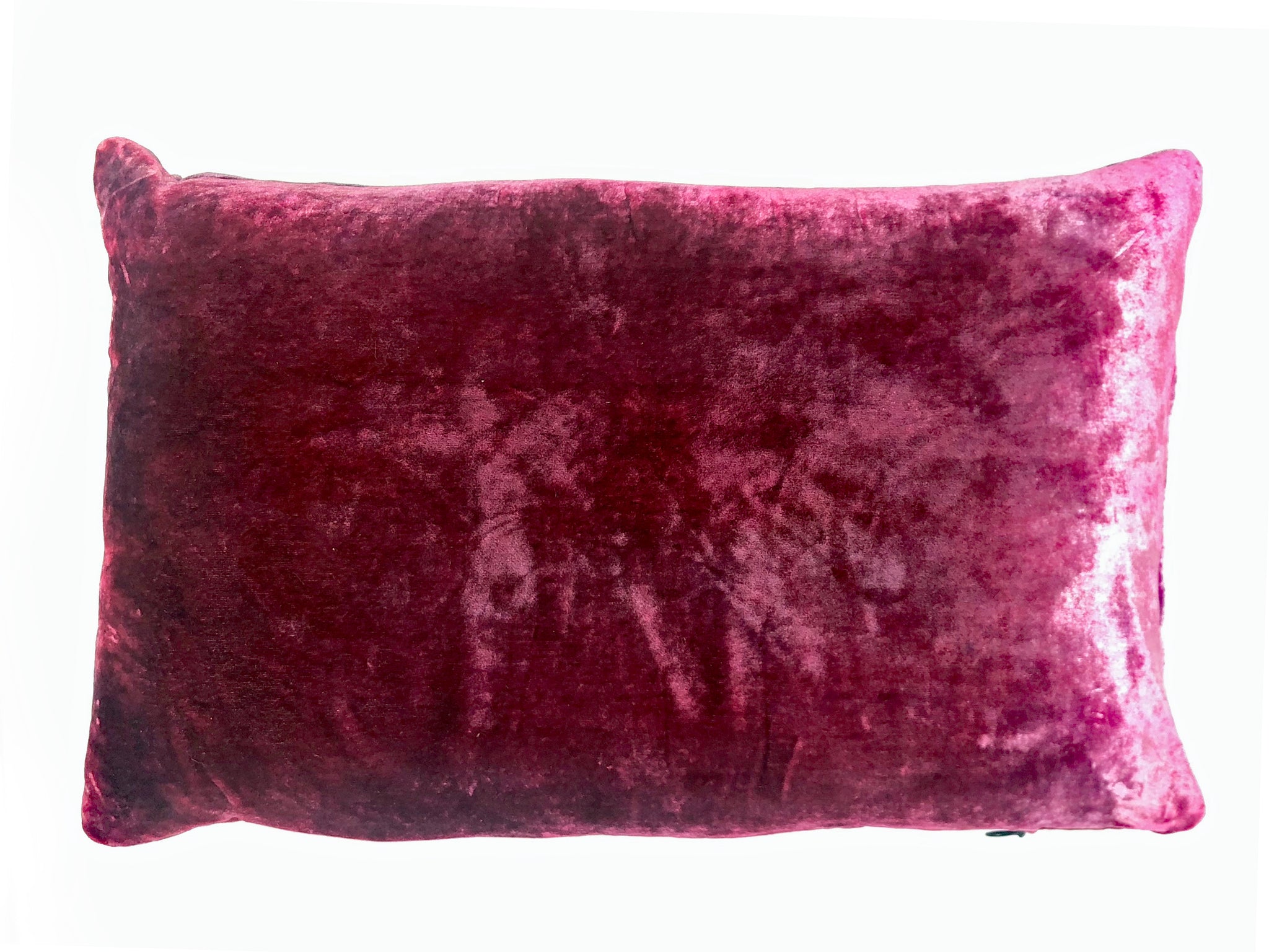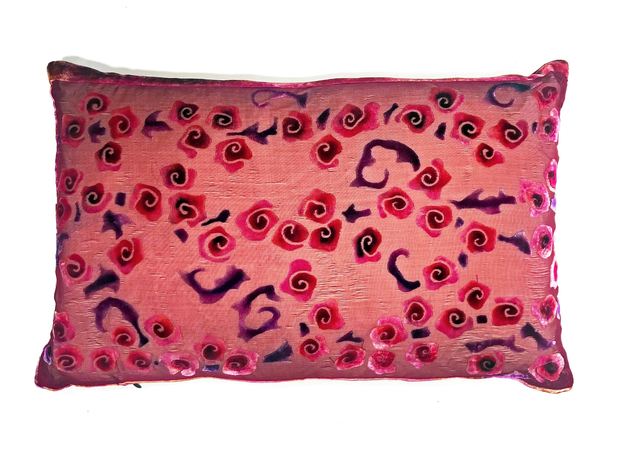 Hand dyed solid berry background. Rayon velvet pattern of rosettes hand painted in blending shades of purple on prickly stems in shades of berries.