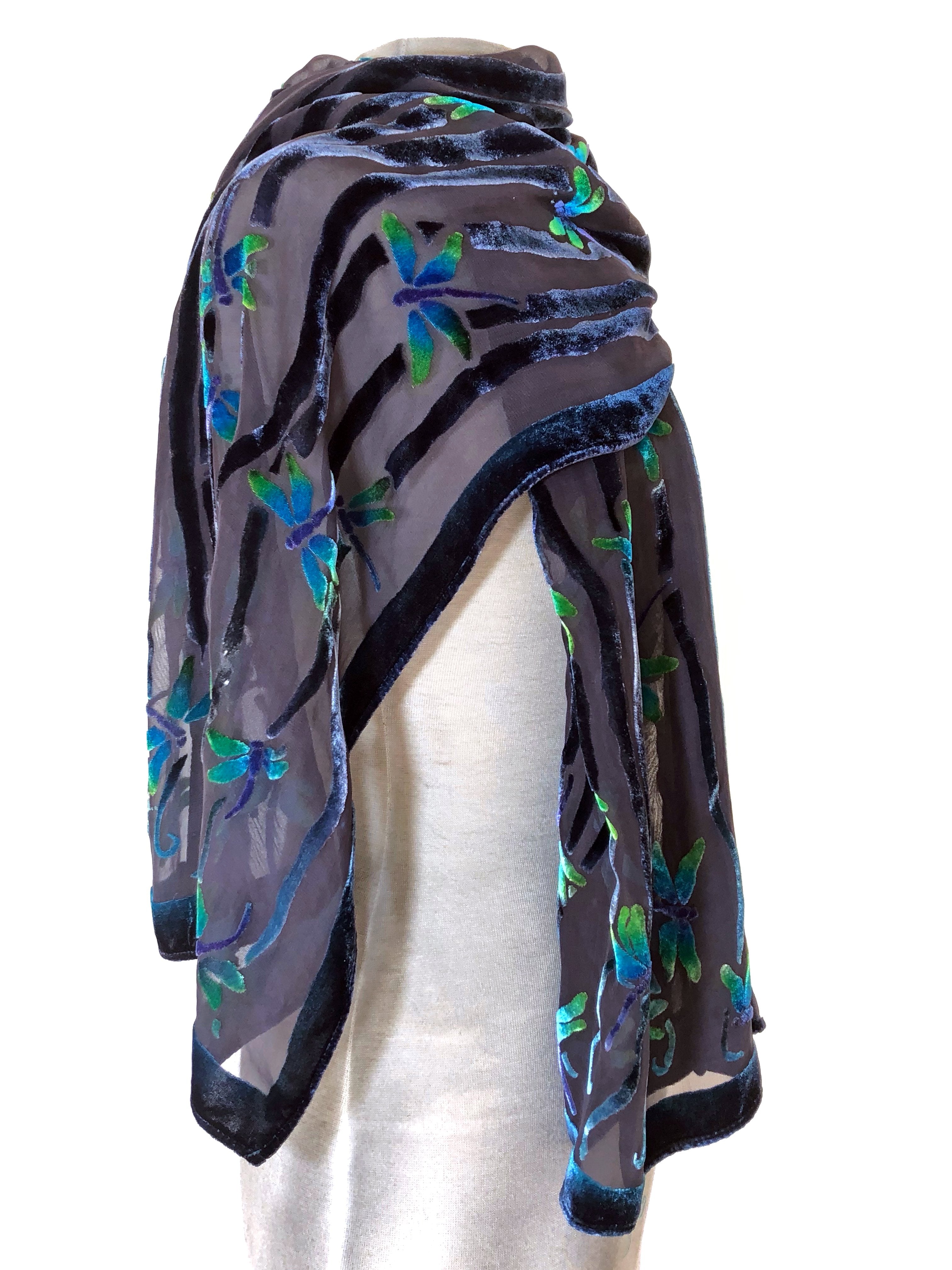 "This iridescent dragonfly scarf/poncho is magical with the flickering rich colors of blue, violet and green that change with movement and light. The dragonflies seem to dance. The poncho is so graceful and flattering on, and so beautifully made! Five-star customer service, and as a long-time repeat customer I can assure you that you will treasure any purchase you make in this shop and likely be back for more. 💕"