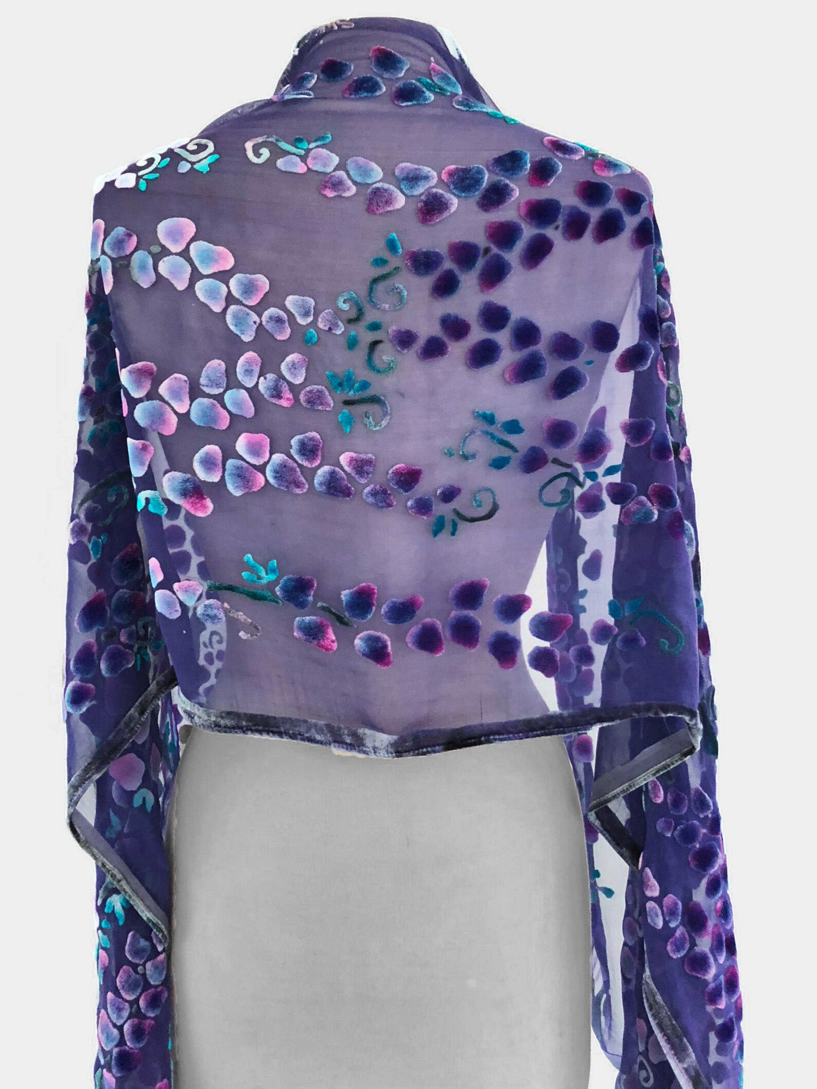 "The colors in this lovely scarf/poncho shimmer in so many beautiful shades of deep pink, royal blue, violet, and maroon as the light hits it that I can only describe it as stunning. Trimmed in the same shade of blue velvet, it’s a masterpiece of beauty. Five-star customer service. 💕"