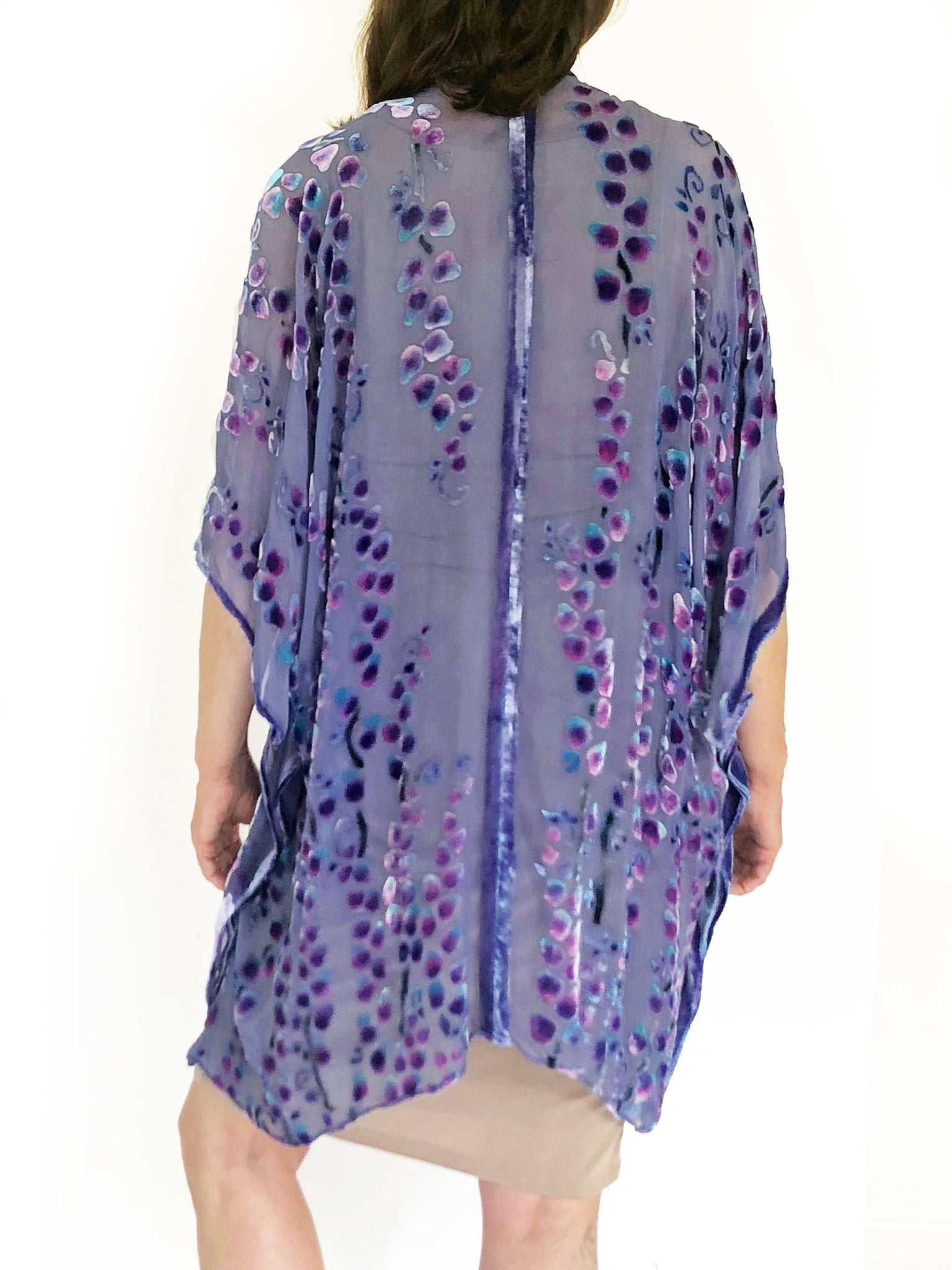 My Willow branch pattern in devoré silk-velvet. Sheer silk chiffon, dyed purple. An all-over shimmering velvet pile which I hand-painted in a watercolor style using more permanent dyes. The dye flows from my brush bleeding in to the pattern.